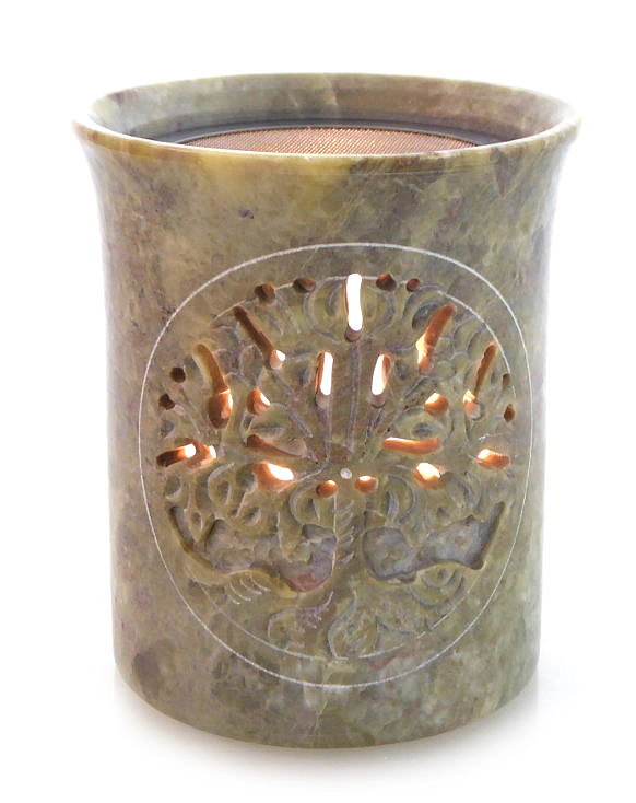 Das Specksteinstövchen „Blume des Lebens“ wurde mit viel Handarbeit sorgfältig und detailgenau gefertigt. Es kombiniert die Freuden des Räucherns mit mythologischen Gedanken zum Verweilen. Sanfte Wurzeln symbolisieren die Unterwelt, starker Boden die Welt. Das luftige Blätterdach verbildlicht die Oberwelt und schafft somit die Verbindung zwischen Himmel und Erde, Diesseits und Jenseits.