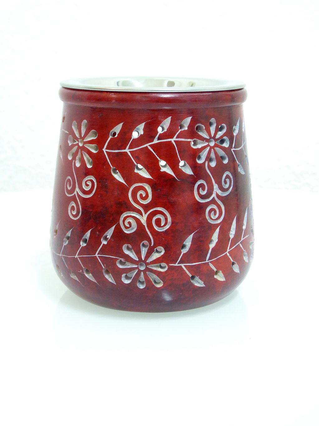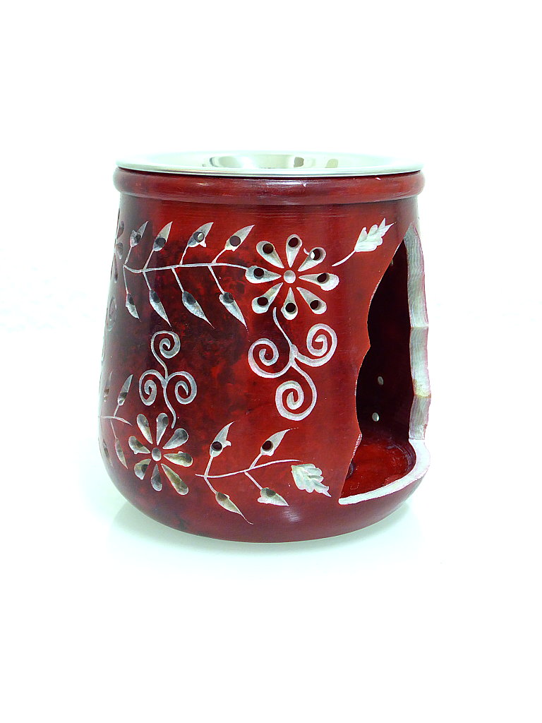 Dieses Räucherstövchen werden von den indischen Kunsthandwerkern nach Herstellung der Grundform aus Speckstein zunächst rot lasiert. Anschließend werden die Verzierungen in den Stein graviert. So erhält „Blütenkönigin“ eine ganz besonders wertvolle Optik und Haptik. Die durch die Lasur noch leicht erkennbare Maserung des Specksteins, machen jedes Stück zu einem Unikat.