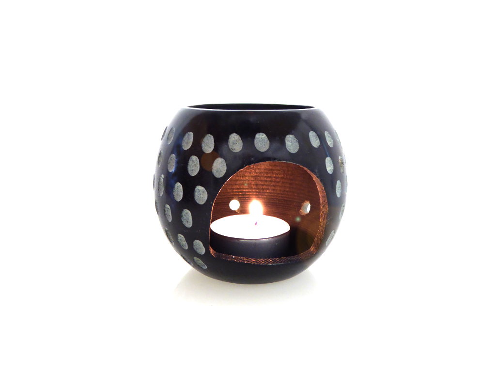 Wunderschöne, elegant schwarze Duftlampe aus Speckstein mit Sieb. Aufwendige Ausfräsungen, die an Tropfen erinnern, zieren dieses moderne Räuchergefäß.