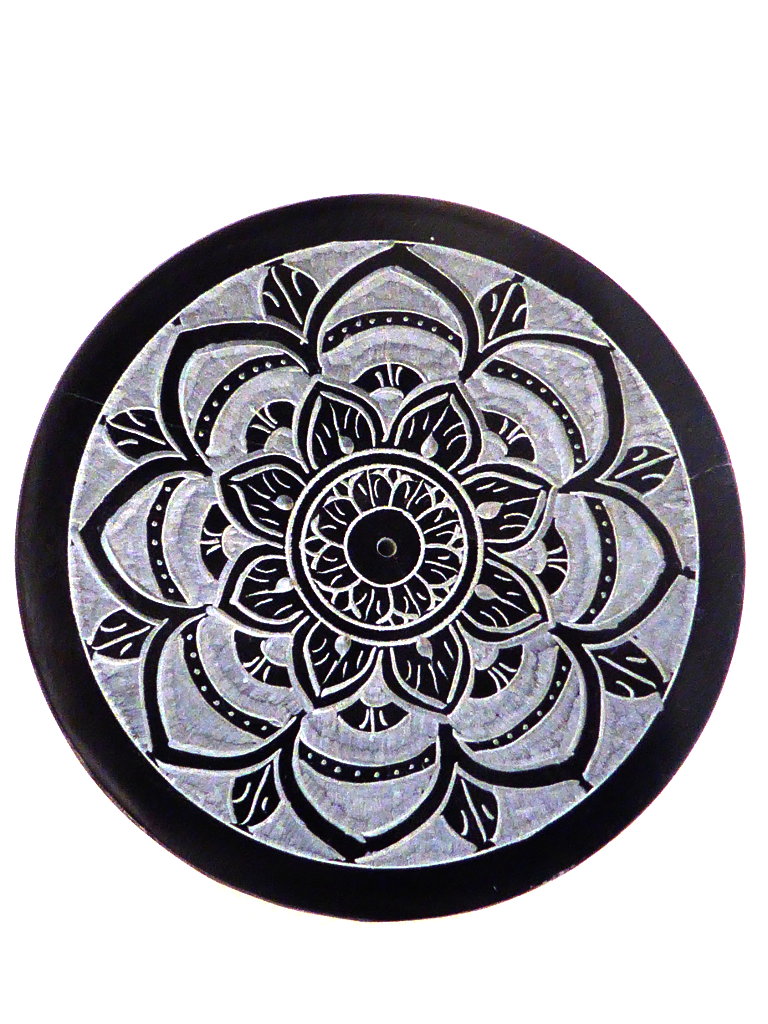 Repräsentativer Räucherstäbchenhalter „Lotusblume“ aus Speckstein. Das klassische Muster ist in den schwarz lasierten Speckstein erhaben eingraviert. In der Mitte bietet der Halter Platz für ein Räucherstäbchen.
