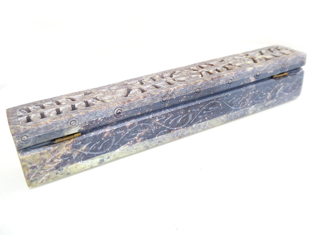 Dekorativer Räucherstäbchenhalter mit diversen Verzierungen. Das Räucherstäbchen wird liegend in die kleine Öffnung eingeführt. Ein kleines „Bänkchen“ sützt das Holzstäbchenende, sodass es schwebend im Inneren allmählich verglimmen kann. Die abfallende Asche wird sicher aufgefangen. Der Deckel wurde aufwendig verarbeitet und ist mit einem Scharnier befestigt.