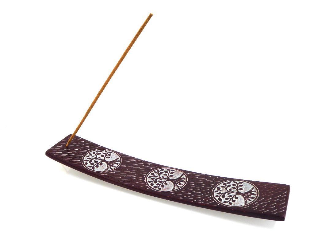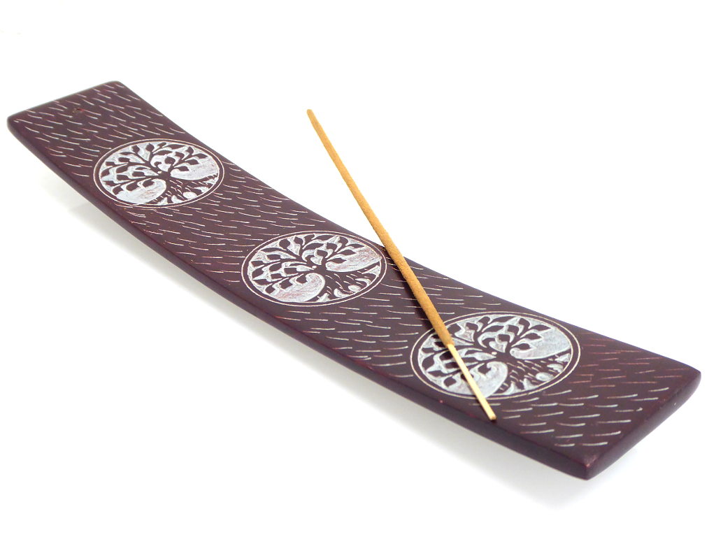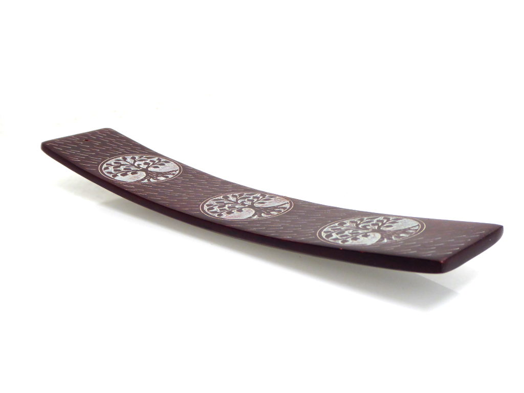 Von der Seite betrachtet erinnert der Räucherstäbchenhalter an ein kleines Schiffchen. Dieses zieren drei dekorative Symbole vom „Baum des Lebens“. Obwohl verziert, wirken die Muster dennoch stilvoll und dezent.