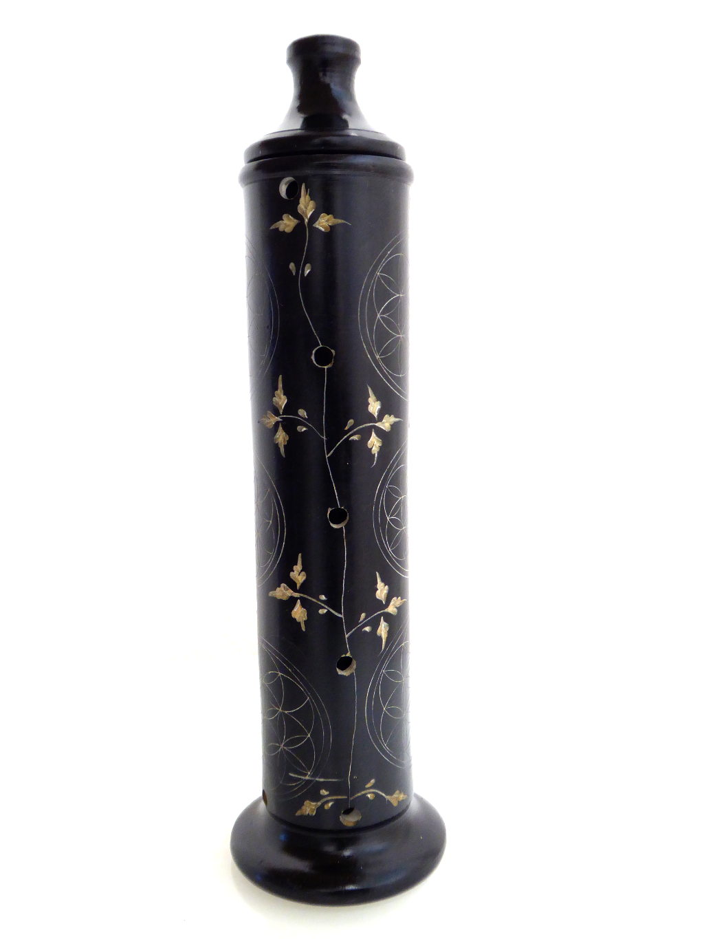 Interessanterweise werden bei diesem Räucherstäbchenhalter die Stäbchen im Deckel befestigt und verglimmen von unten nach oben. Dadurch verteilt sich der Rauch im Turminneren und tritt durch die Belüftungslöcher aus. Insgesamt können 5 Räucherstäbchen gleichzeitig verglimmen.