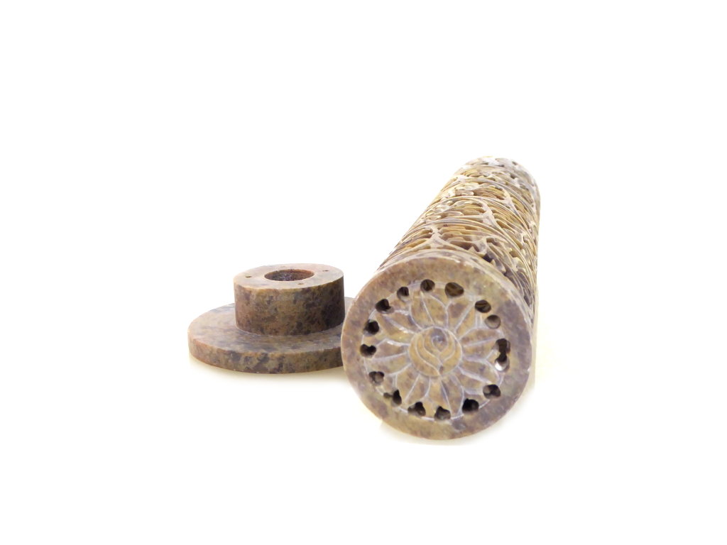 Klassischer, sehr dekorativer Räucherturm aus massivem, naturbelassenem Speckstein mit kunstvoll gearbeitetem Rankendesign. Geeignet für bis zu vier Räucherstäbchen.