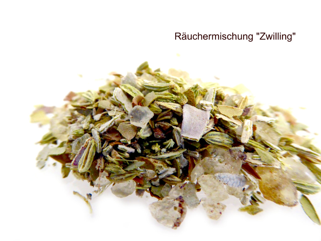 Mit ihrem humorvollen, kommunikativen Art und ihrem unersättlichen Wissensdurst finden Zwilling – Geborene (21.05 – 21.06) sehr schnell gesellschaftliche Kontakte. Sie sind sehr lebhafte Menschen mit vielseitigen Interessen. Diese Grundbedürfnisse umrahmen ihre kreative Entwicklung. Die Räuchermischung unterstützt ihre Lebensfröhlichkeit, Kreativität und Flexibilität.