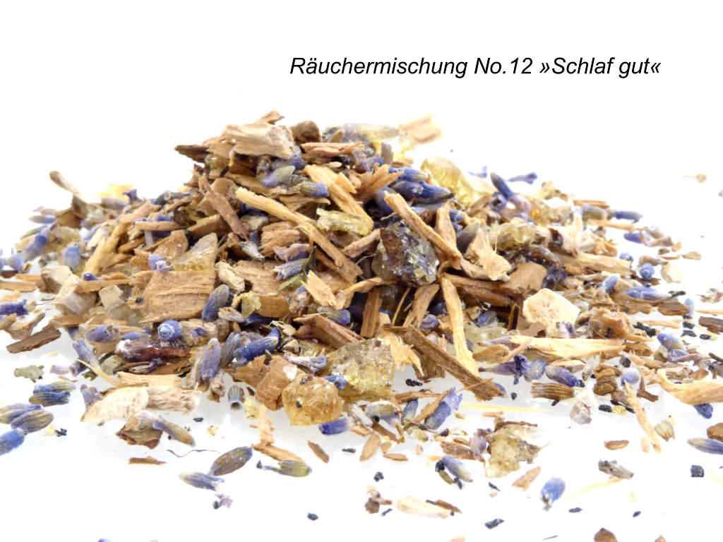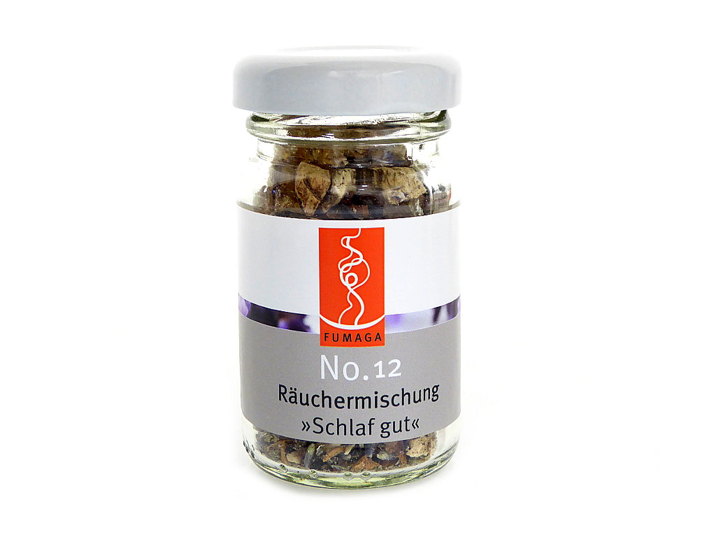 Die Räuchermischung No.12 enthält beruhigende, ausgleichende Substanzen wie z.B. Lavendelblüten und Sandelholz. Auf einem Räucherstövchen aufgelegt entfaltet die Komposition sanft ihren warmen Duft, der durch die Nase aufgenommen harmonisierend und entspannend wirkt.