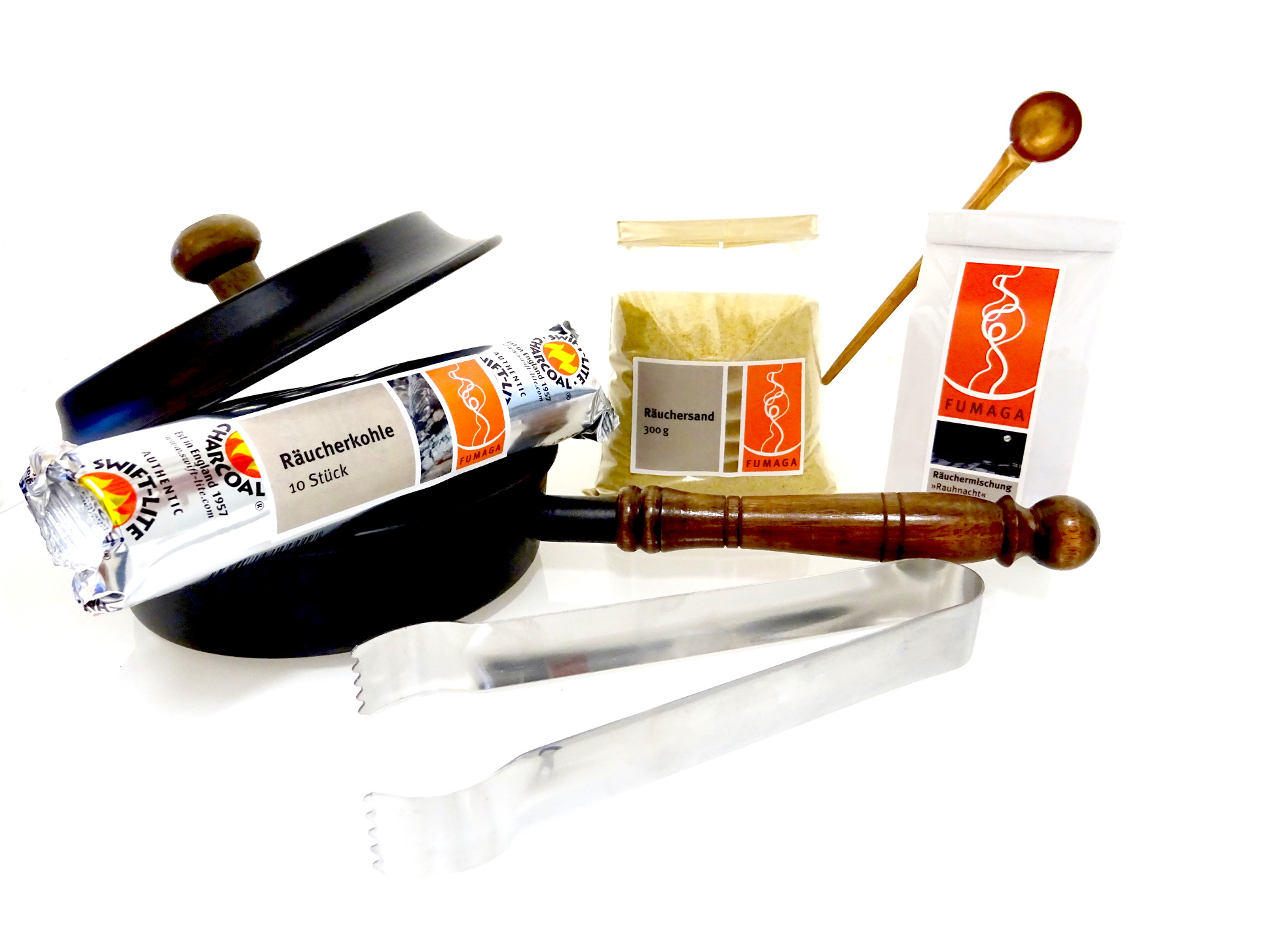 Mit diesem Set können Sie sofort beginnen und Ihre Erfahrungen sammeln. Fumaga hat die notwendigen Utensilien für Sie zusammengestellt. Die stabile Räucherzange liegt aufgrund ihrer Länge sehr gut in der Hand und erleichtert das Entzünden der Räucherkohle.