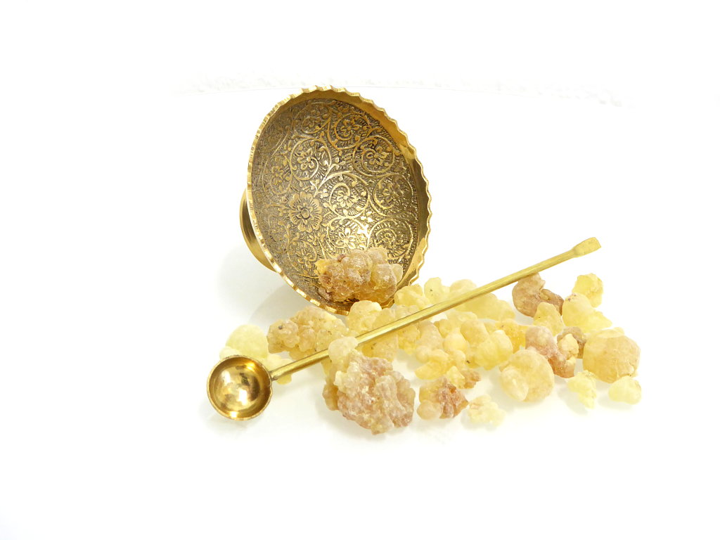 Passend zum Schälchen gibt es einen Räucherlöffel aus Messing. Er erleichtert das Portionieren von Harzen/Räuchermischungen auf Kohle oder auf einem Räuchersieb. Mit dem praktischem, flachen Griffende können Sie aufgelegtes Räucherwerk einfach verschieben. Länge: 14 cm