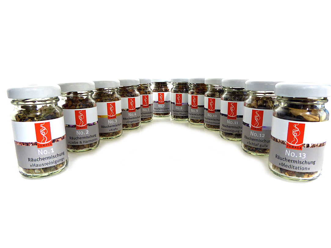 Die vollständige Fumaga Räucherserie No.1 – No.5 und No.7 – No.13 mit je 50 ml im Glas. Wahlweise mit Räucherlöffel.